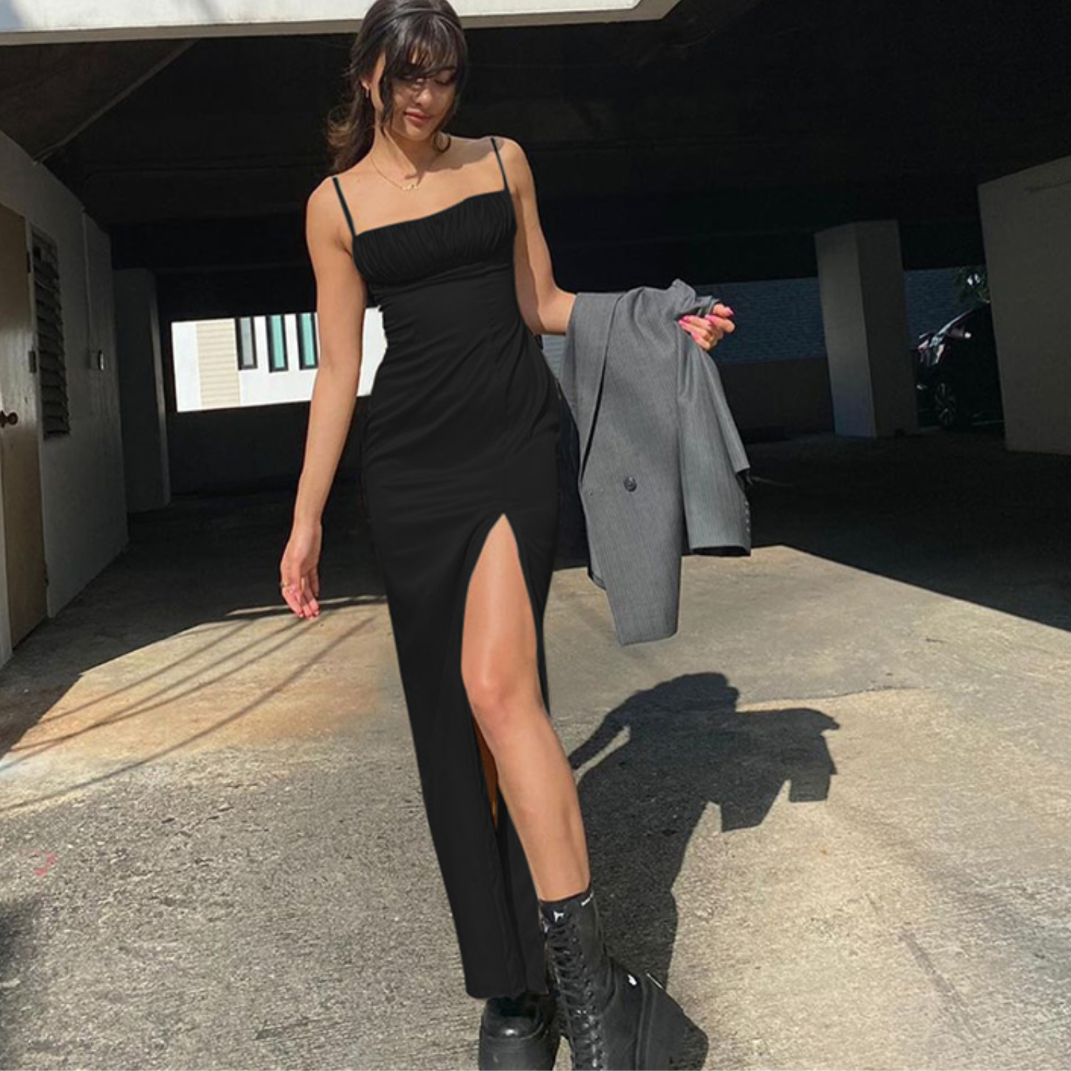 Sling Split Dress In Black