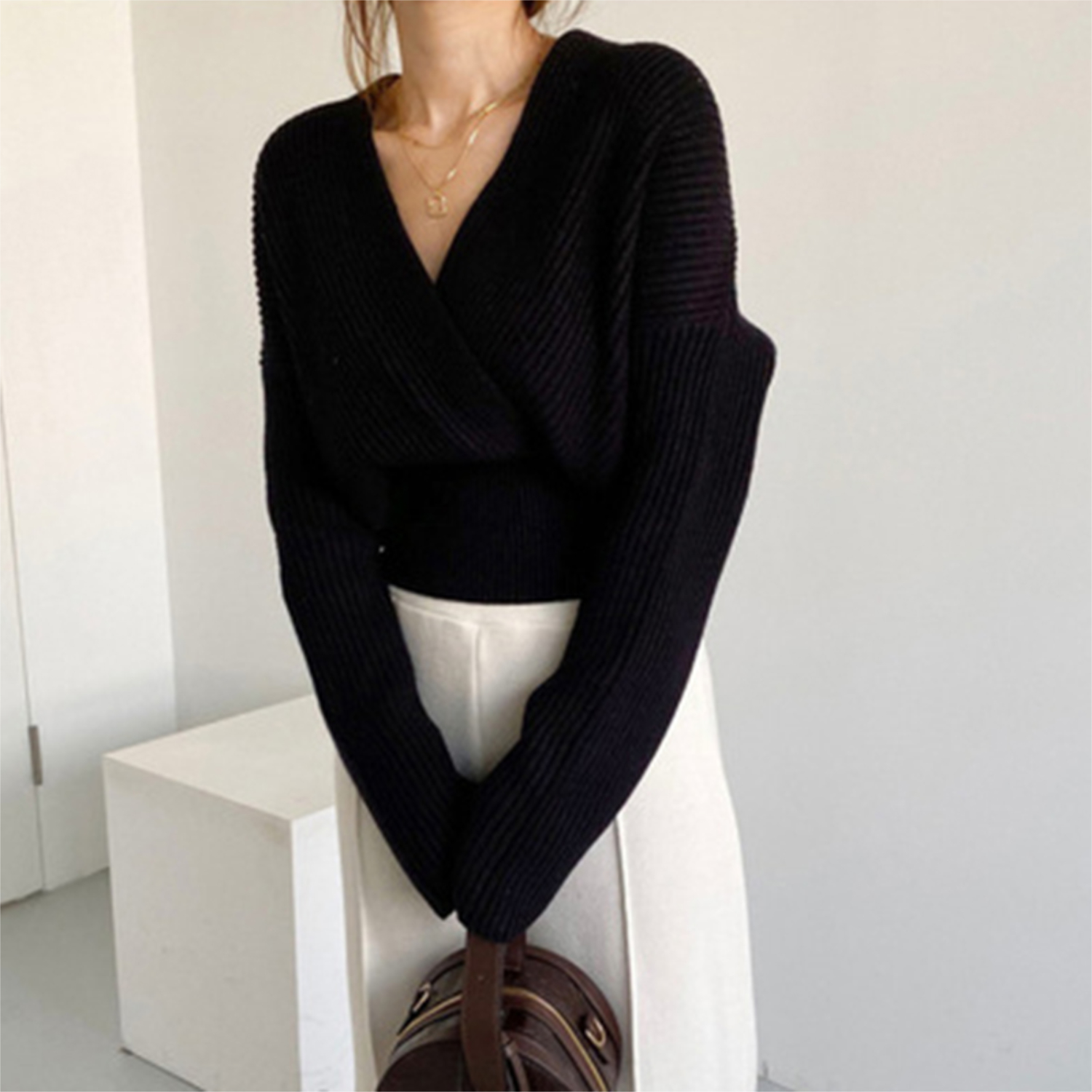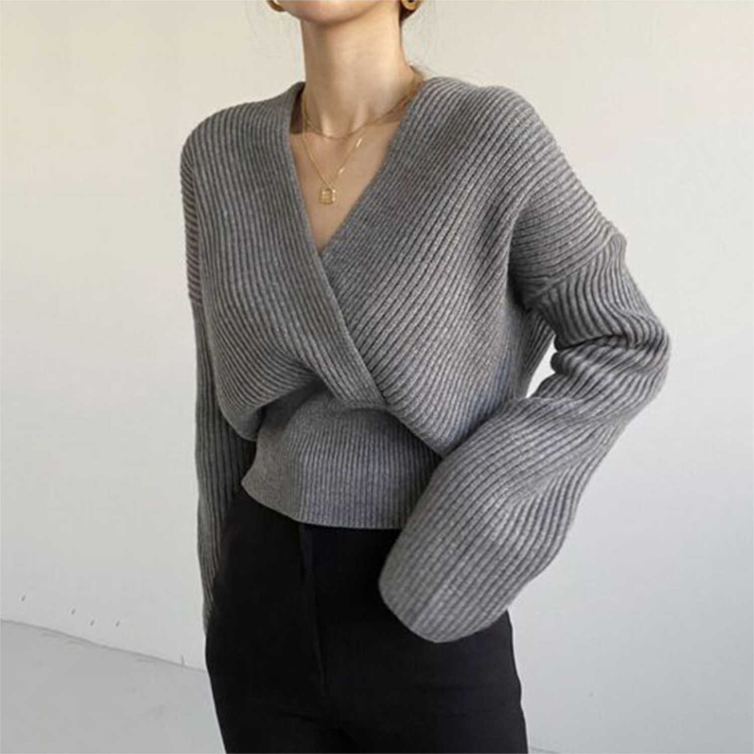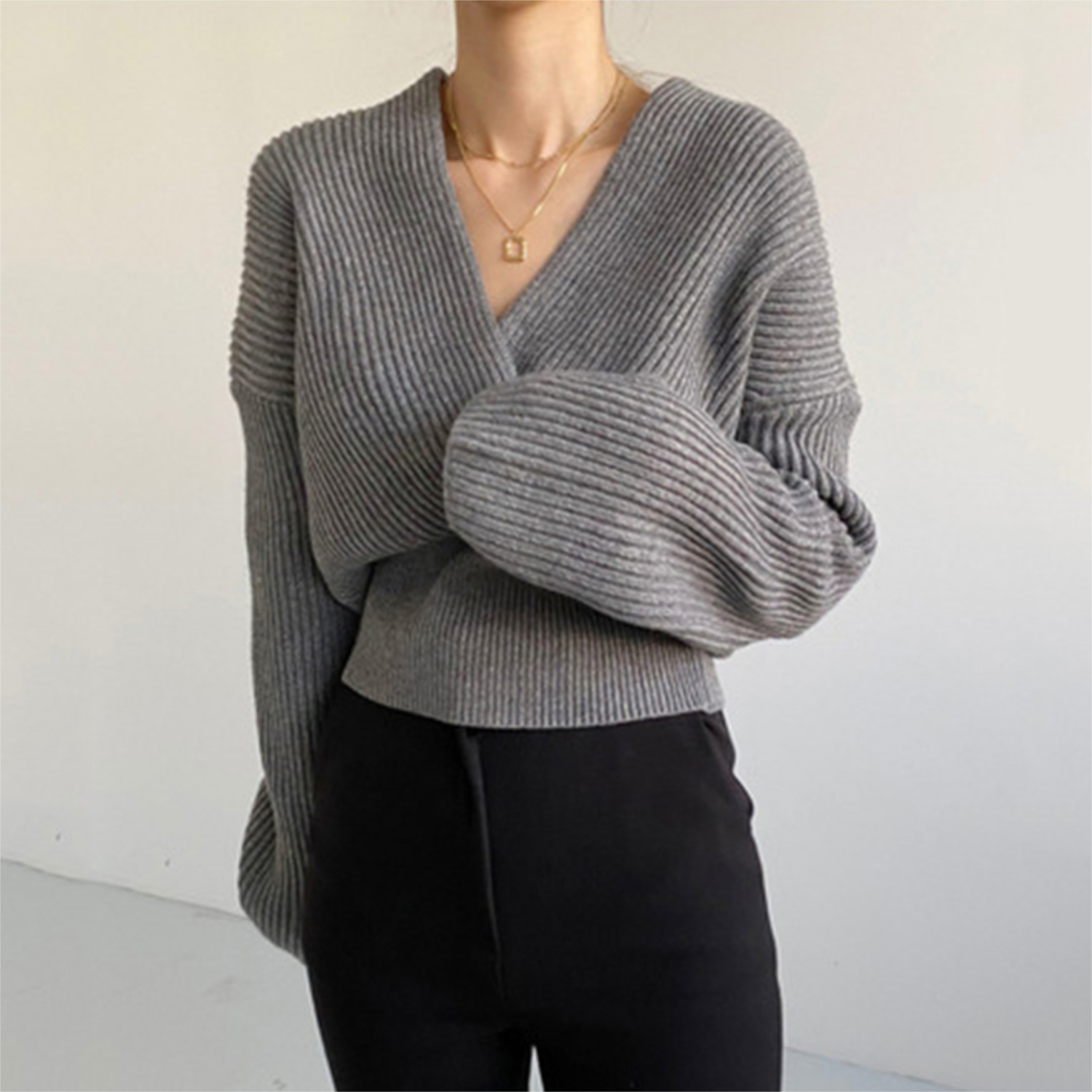 V-neck Cross Long Sleeve Sweater | Freesize | Sleeve: 47 / Chest: 104 / Shoulder: 54 / Length: 52 cm | Colour: Grey / Black | Free Shipping Over $45.