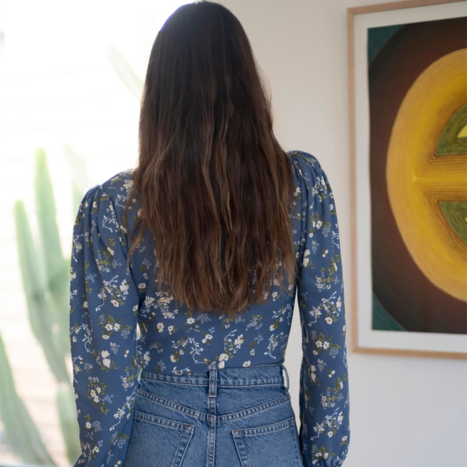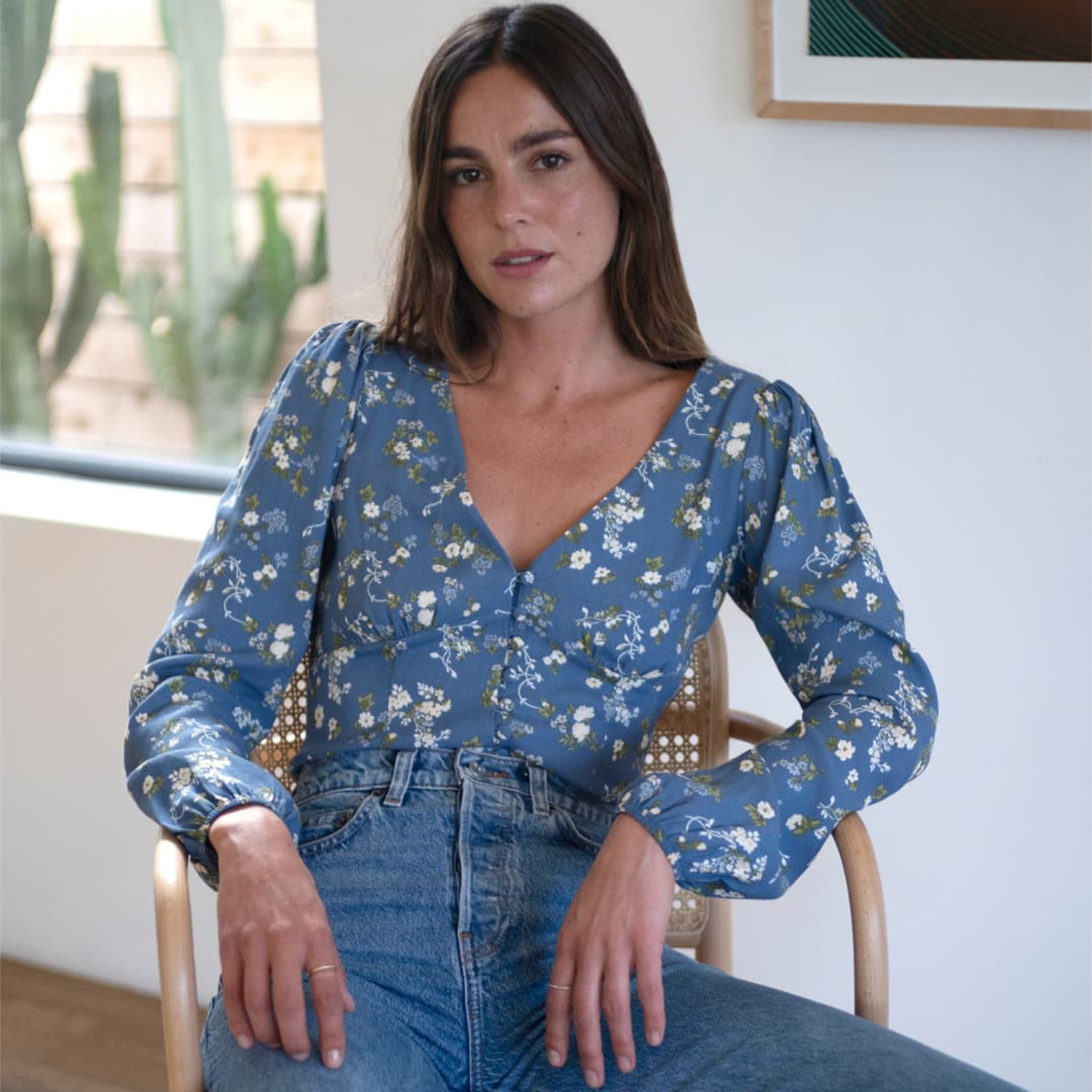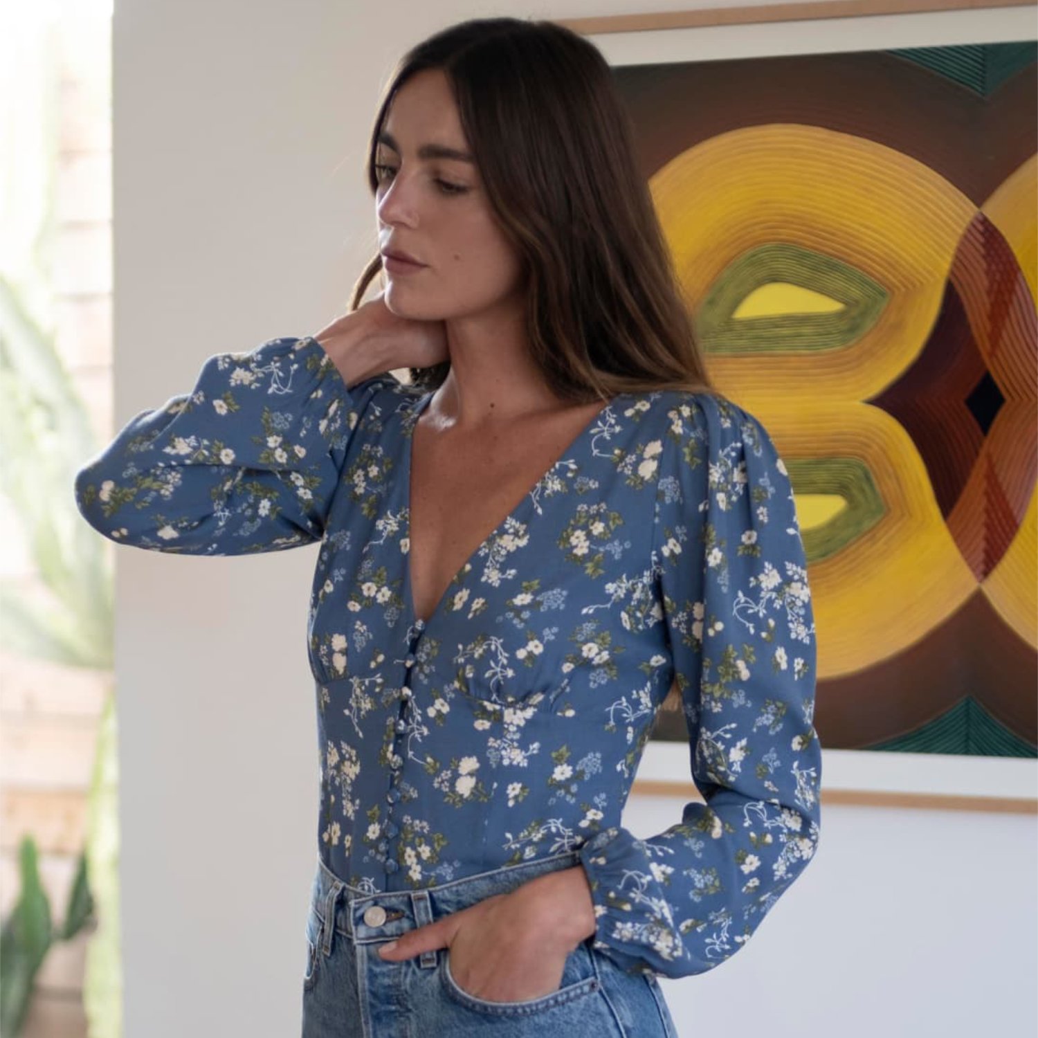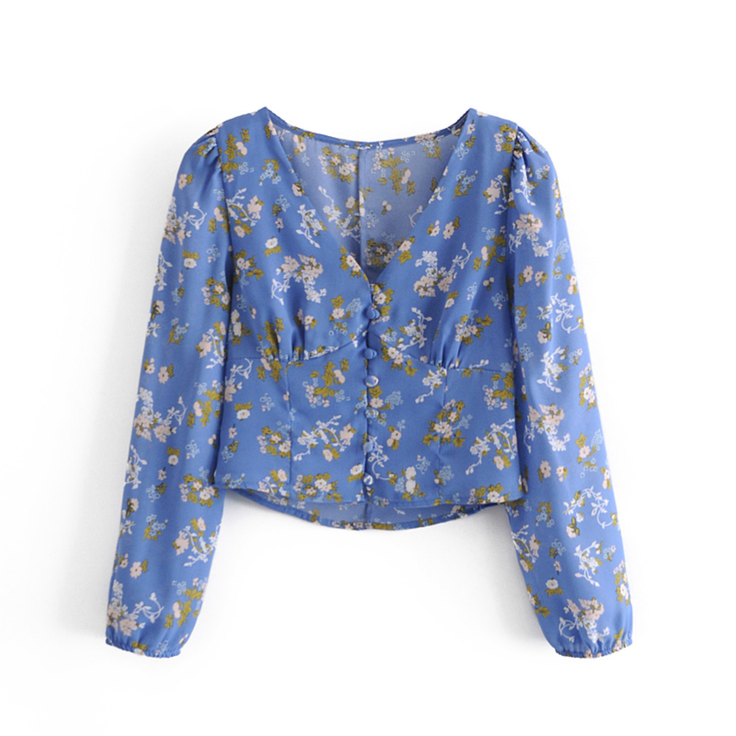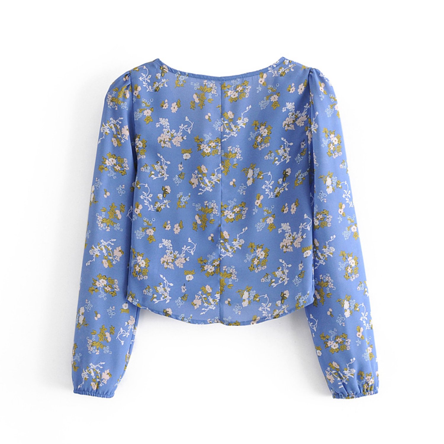 2021 Summer - Pastoral Blue Floral Print V-neck Blouse