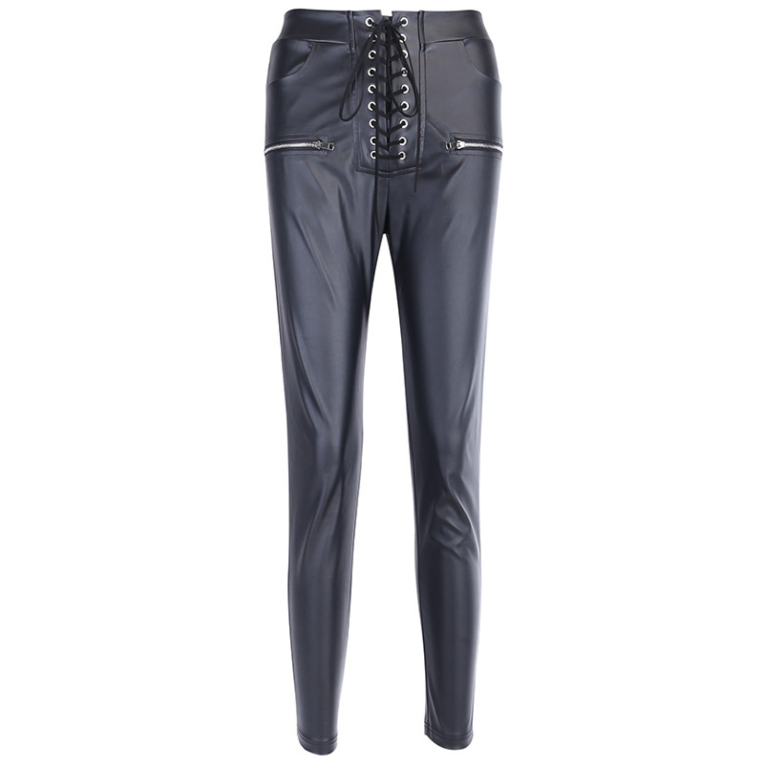 Lace-up Zipper PU Leather High Waist Slim Pant