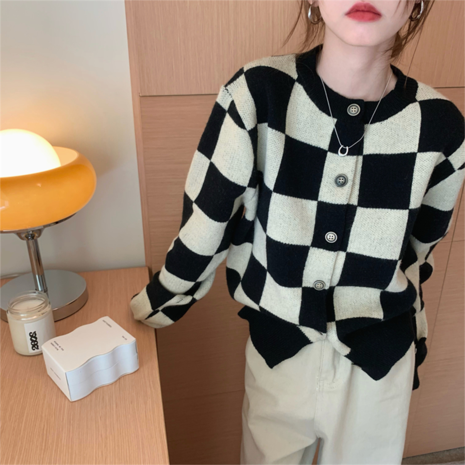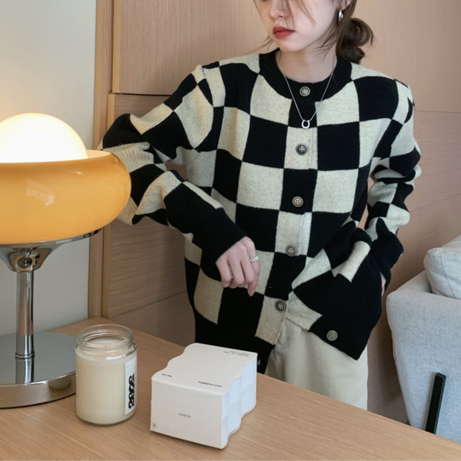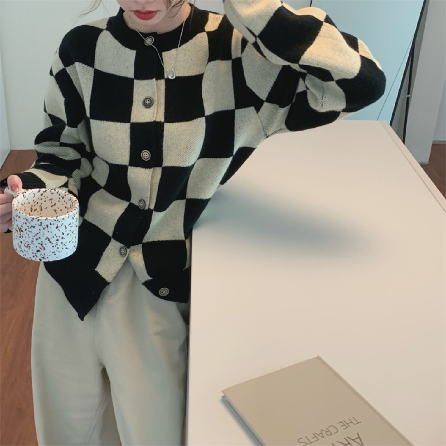 Korea Chic Autumn Fashion Loose Checkerboard Knitted Cardigan